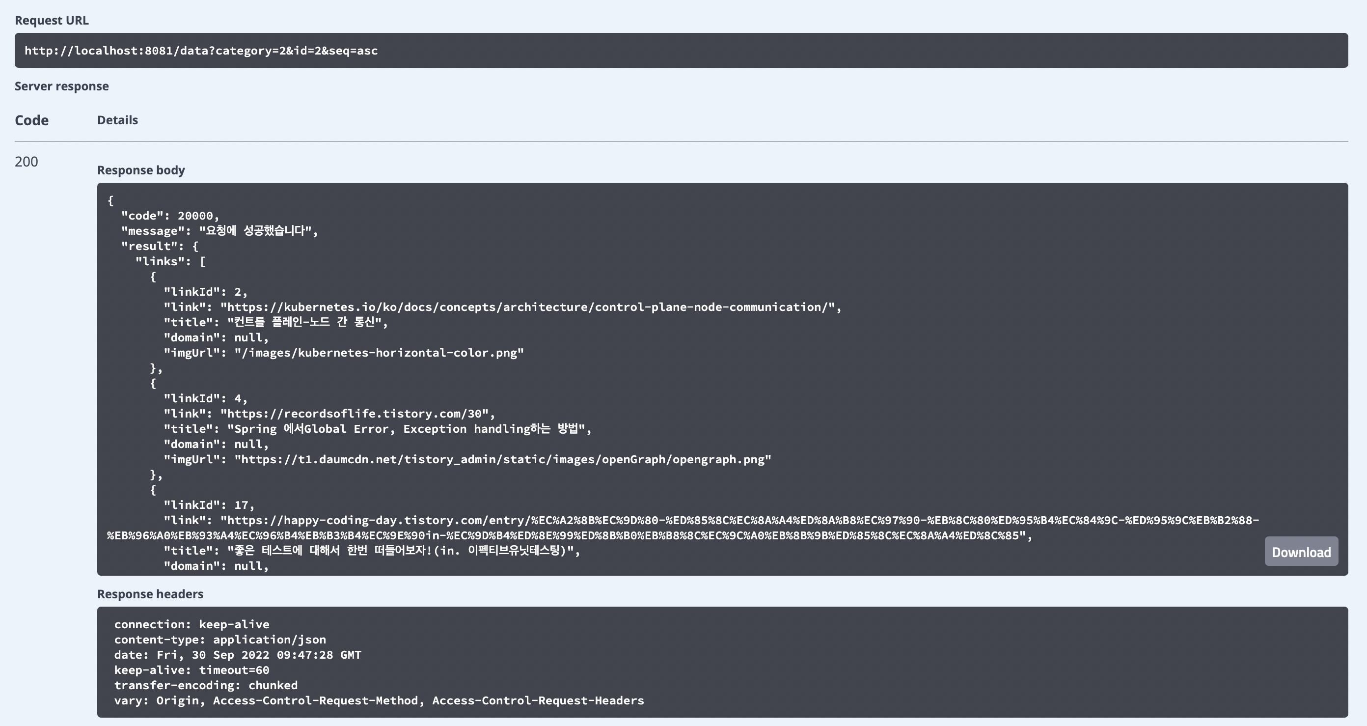 - 만약 Default값으로 값이 들어가 있다면 바로 Execute버튼을 클릭하면 실행이 된다. Default값 외의 다른 값으로 Test해보고 싶을 때는 다른 값을 넣어준다.