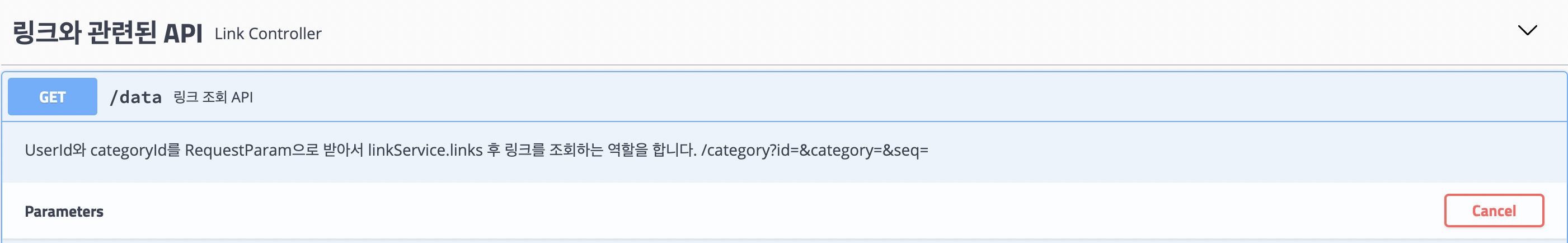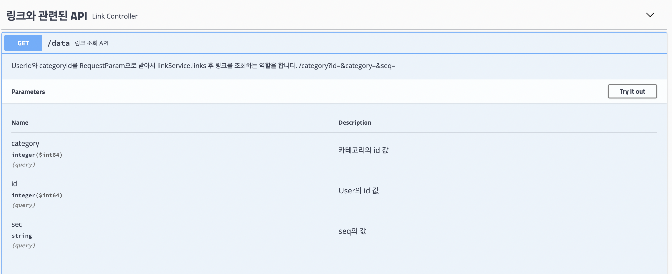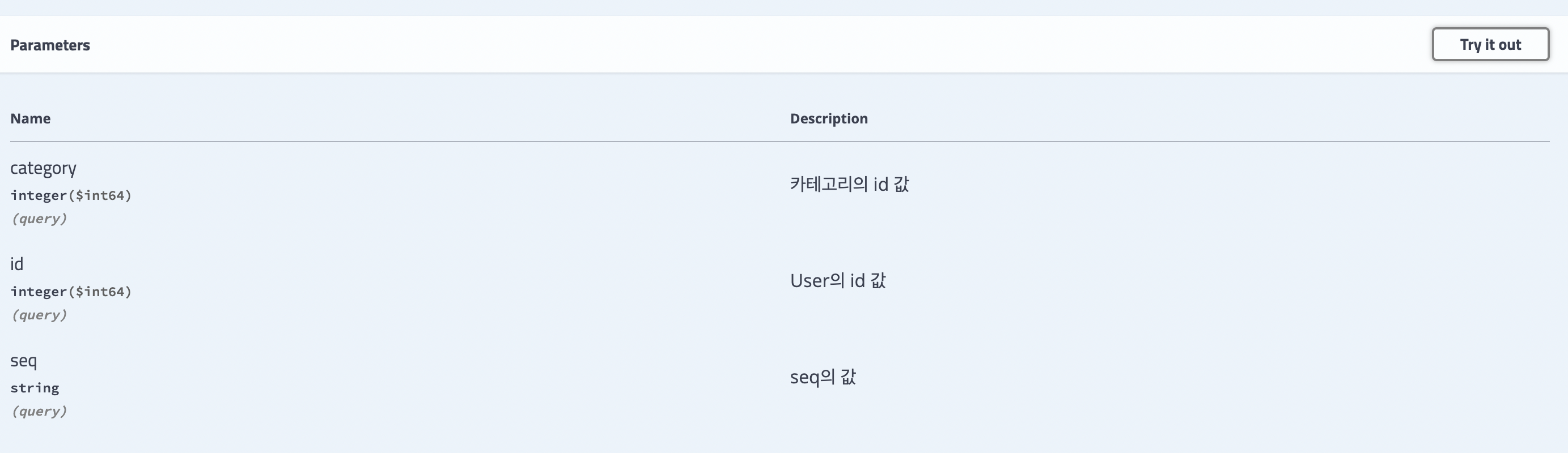 위의 @ApiParam 어노테이션을 통해 작성한 Swagger 화면
