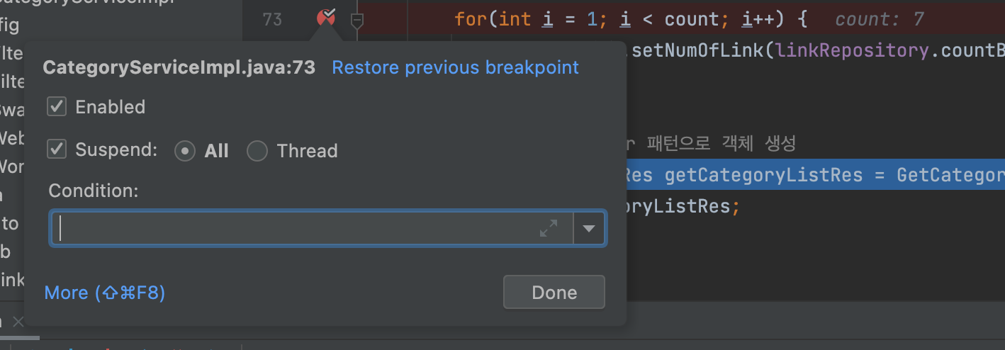 예를 들어 Step Into를 사용하면 for문이 50번까지 돌 때 49번째의 값을 확인하고 싶으면 Step Into를 49번 실행시켜야 한다. 하지만 Break Point에 우클릭을 해서 Condition에 확인하고 싶은 값의 Boolean 형태로 값을 넣는다. 그러면 해당하는 for문의 값만 실행시킬 수 있다.