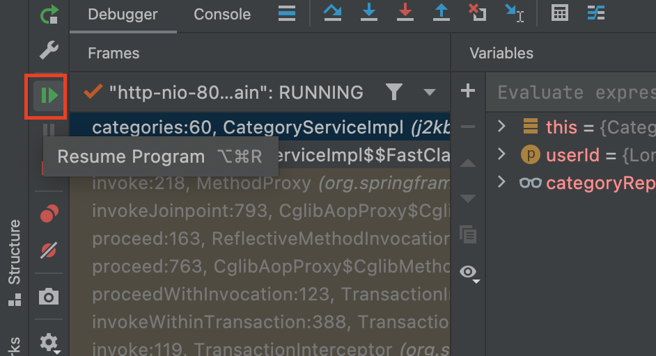 프로젝트 화면 상단에 실행시키는 버튼 옆에 벌레같이 생긴 버튼을 누르면 디버거 모드로 실행된다.