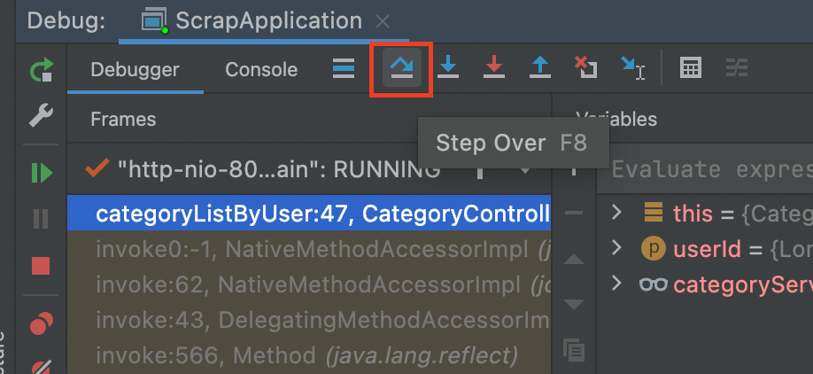 Step Over는 코드 다음 줄로 넘어간다. method call 안으로 들어가지 않는다.