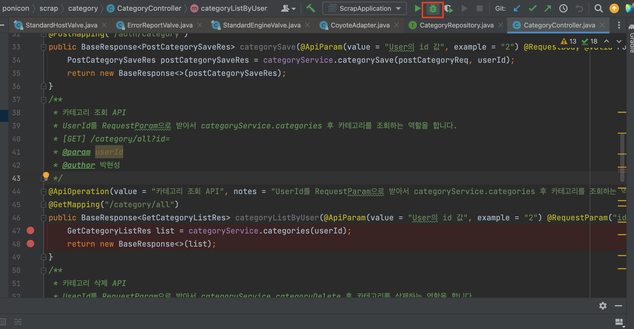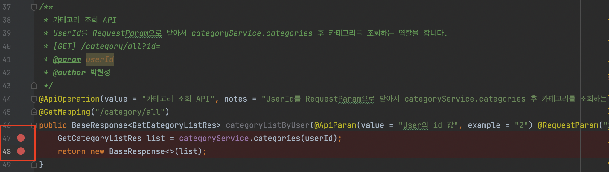 47번 줄, 48번 줄을 보면 빨간색 점이 찍혀있는 것을 볼 수 있다. 이는 Break point로 디버거 모드로 실행시켰을 때 코드 실행이 멈추는 지점
