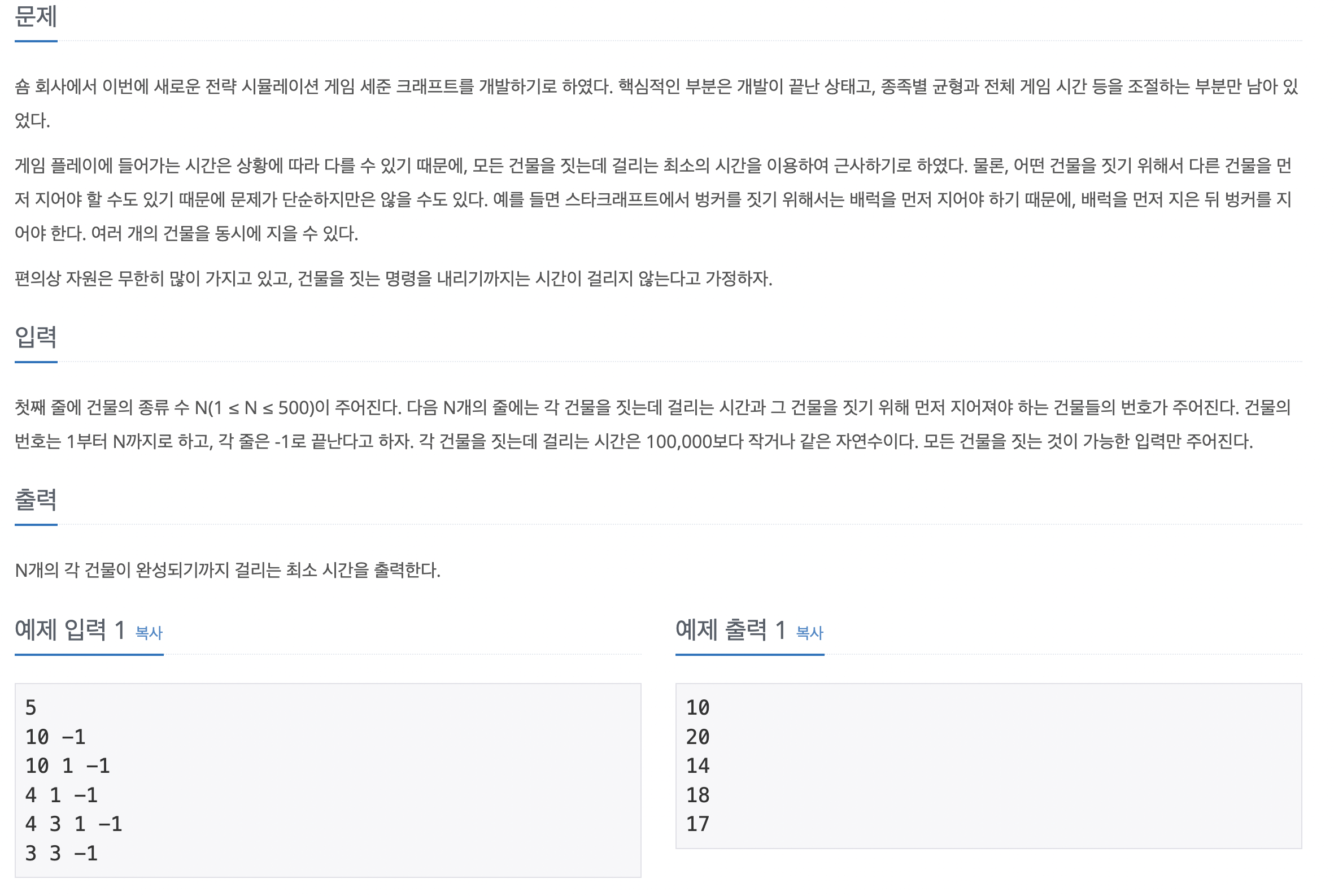 각 건물을 노드라고 생각하면 그래프 형태에서 노드 순서를 정렬하는 알고리즘인 위상 정렬을 사용하는 문제이다. 건물 수가 최대 500, 시간 복잡도가 2초이므로 시간제한 부담은 거의 없다. 입력을 바탕으로 자료구조를 초기화한다 인접 리스트로 그래프를 표현할 때는 인접 노드, 건물 번호를 Node로 선언하여 연결한다. 진입 차수 배열은 [0, 1, 2, 1], 정답 배열은 모두 0으로 초기화한다. 위상 정렬을 실행하면서 각 건물을 짓는데 걸리는 최대 시간을 업데이트합니다. 업데이트 방법은 Math.max(현재 건물에 저장된 최대 시간, 이전 건물에 저장된 최대 시간 + 현재 건물의 생산 시간)이다. 정답 배열에 자기 건물을 짓는 데 걸리는 시간을 더한 후 정답 배열을 차례대로 출력한다.