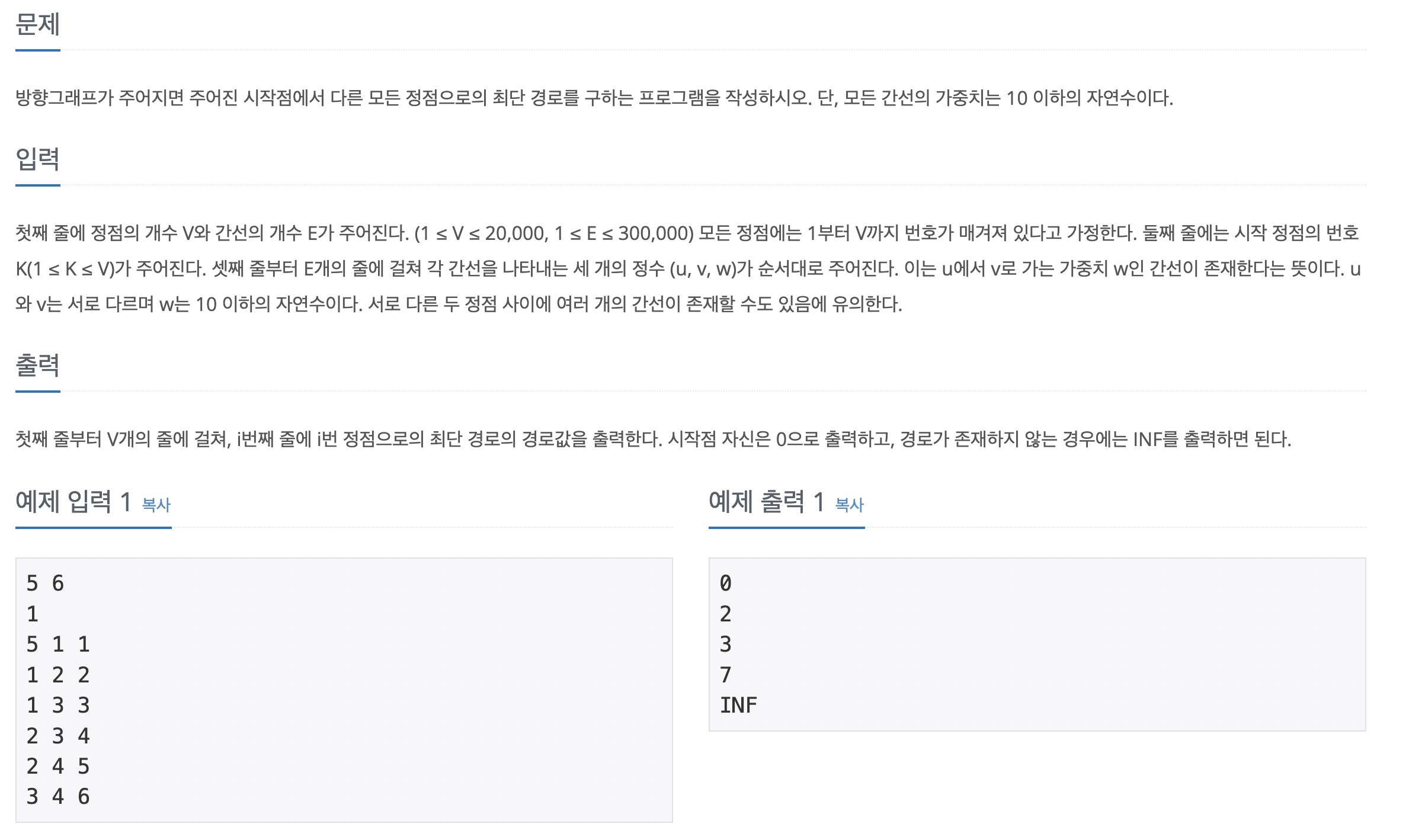 - Min(선택 노드의 거리 배열의 값 + 에지의 가중치, 연결 노드의 거리 배열의 값이 업데이트된 경우 연결 노드를 큐에 삽입)