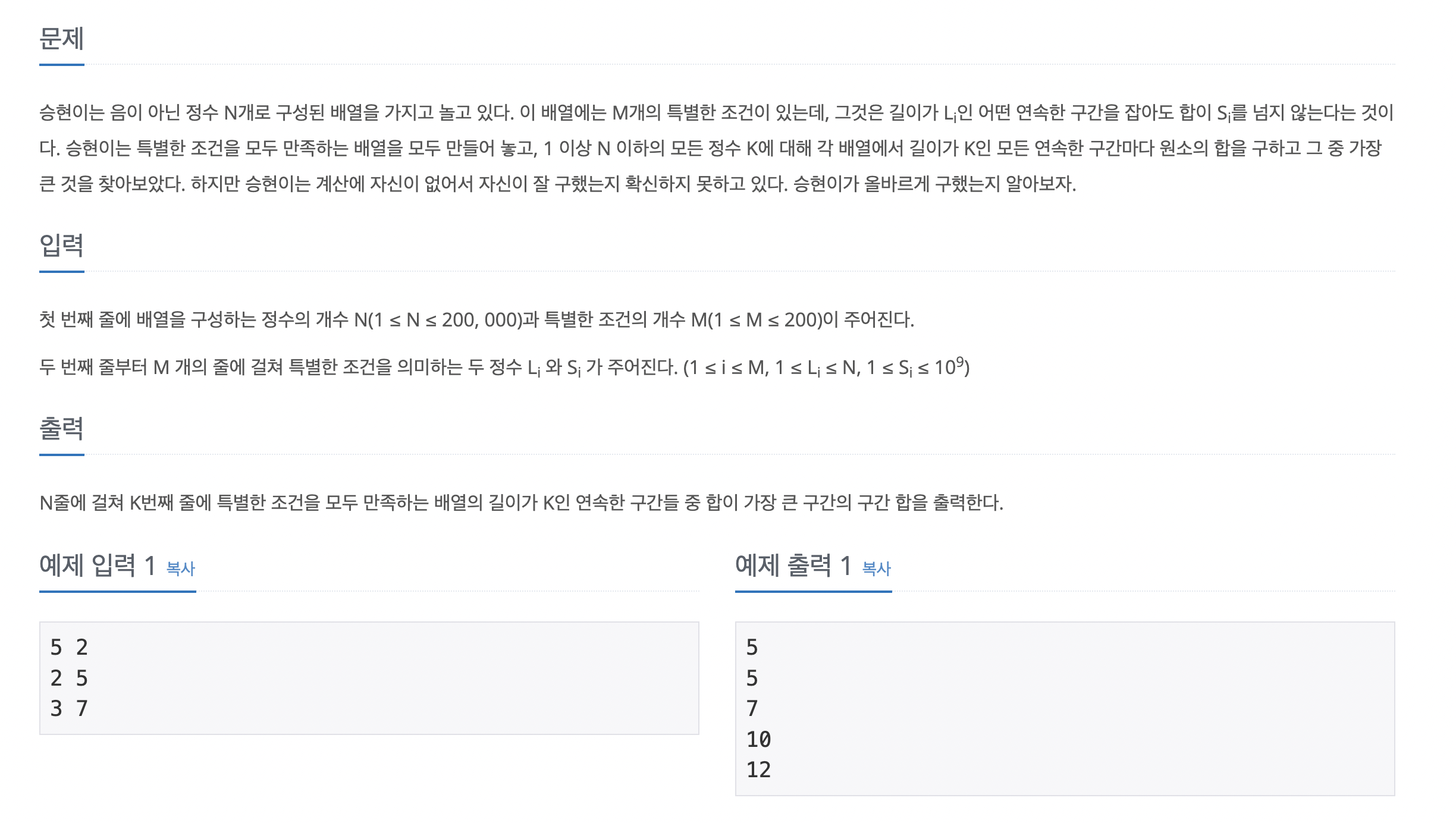 이와 비슷한 문제를 푼 적이 있어서 오래 걸리지는 않았다. 처음에 이 문제를 접했을 때 구간에서 다음 구간까지 더해주는 것에서 방법을 떠올리기 힘들었다.