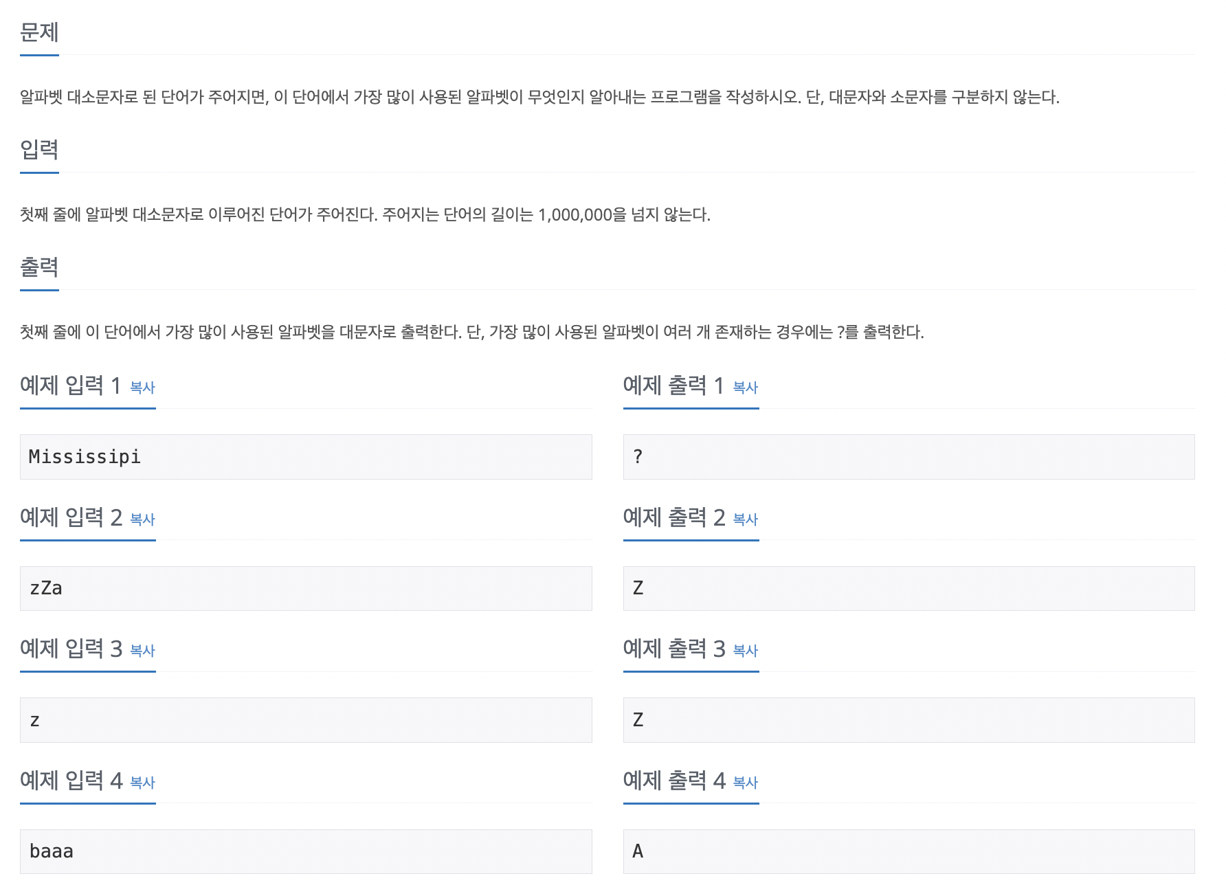 정답 출력을 다 대문자로 진행하기 때문에 문자를 다 대문자로 바꾸어 준 후 알파벳 개수만큼 배열을 생성한다. for 문에 i = 0부터 i < str.length()까지 하나씩 탐색하면서 입력받은 문자에서 - 65를 해준다. (arr [str.charAt(i) - 65]++ ) max값을 arr [str.charAt(i) - 65]로 바꾸어준다. 또한 ch에 그 단어를 저장해준다. 만약 max값이랑 arr [str.charAt(i)]값이랑 같으면 ch에 '?'를 저장해준다. for문을 끝내고 ch를 출력해준다.