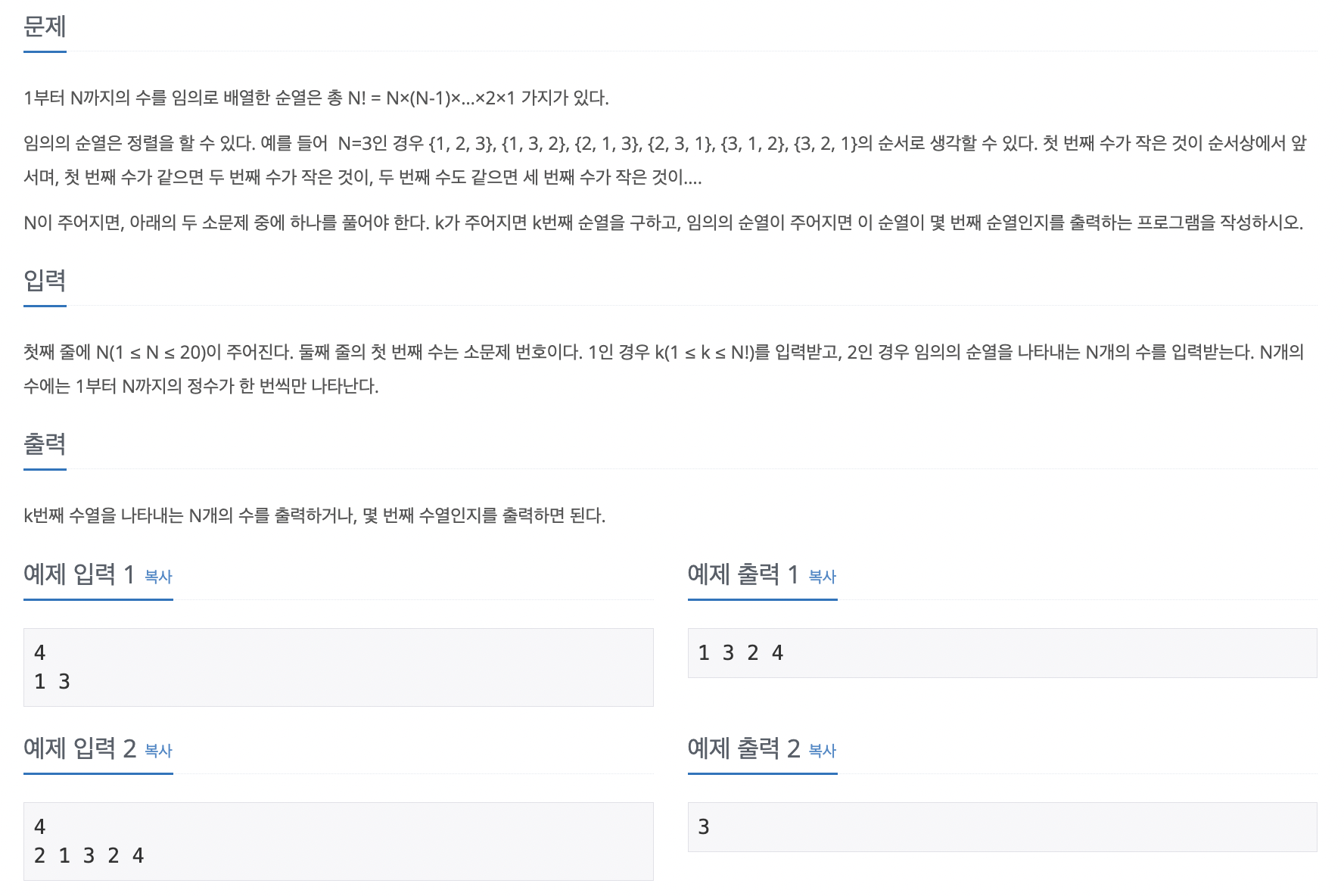 - N자리 순열의 숫자를 받아 몇 번째 순서의 숫자인지 확인한다.(현재 숫자 - 자기보다 앞 숫자 중 이미 사용한 숫자)