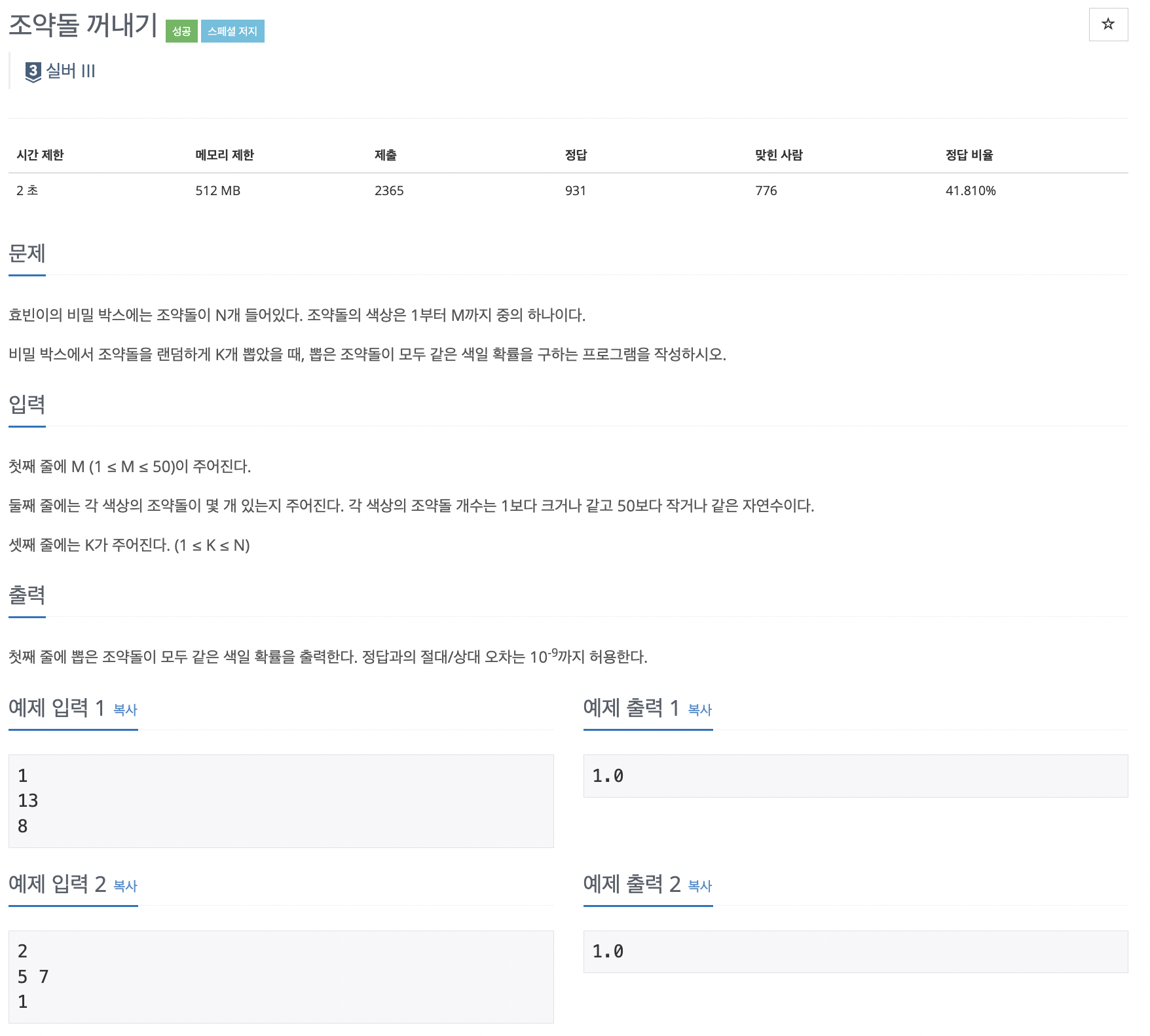 단순하게 확률로 풀었습니다. 조약돌 개수를 배열에 담아서 한 색깔의 조약돌만 뽑을 확률을 색깔별로 모두 구하고 각각의 확률을 더해 정답으로 출력했다.