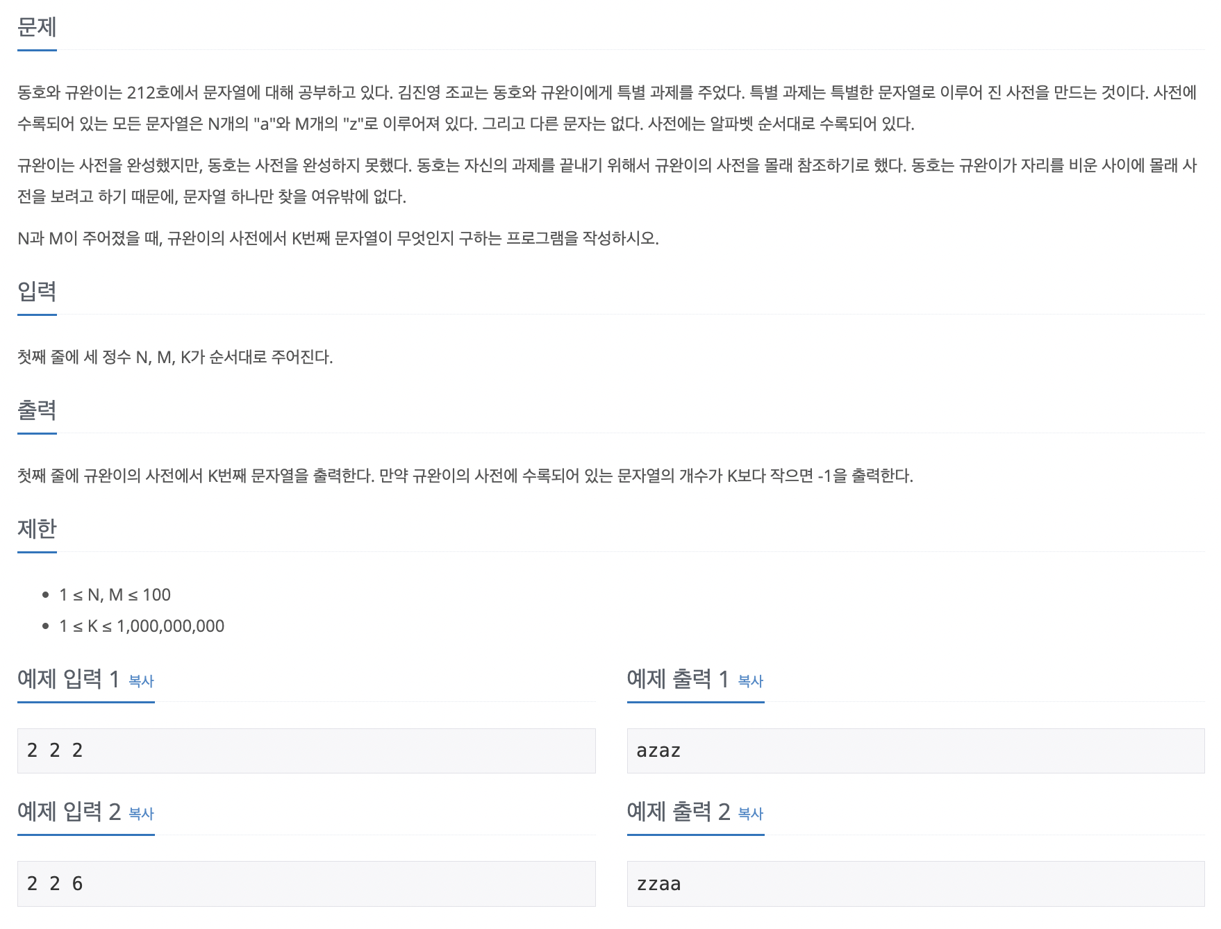 a와 z의 개수가 각각 N, M개일 때 이 문자들로 만들 수 있는 모든 경우의 수는 N + M 개에서 N개를 뽑는 경우의 수 또는 N + M개에서 M개를 뽑는 경우의 수와 동일하다. arr배열을 초기화하고, 점화식으로 값을 계산해 저장한다. 몇 번째 문자열을 표현해야 하는지를 나타내는 변수를 K라고 하자 현재 자릿수에서 a를 선택했을 때 남아 있는 문자들로 만들 수 있는 모든 경우의 수는 T이다. T와 K를 비교해 문자를 선택한다. 문자 선택 기준은 T >= K : 현재 자리 문자를 a로 선택 T < K : 현재 자리 문자를 Z로 선택하고, K = K - T로 업데이트