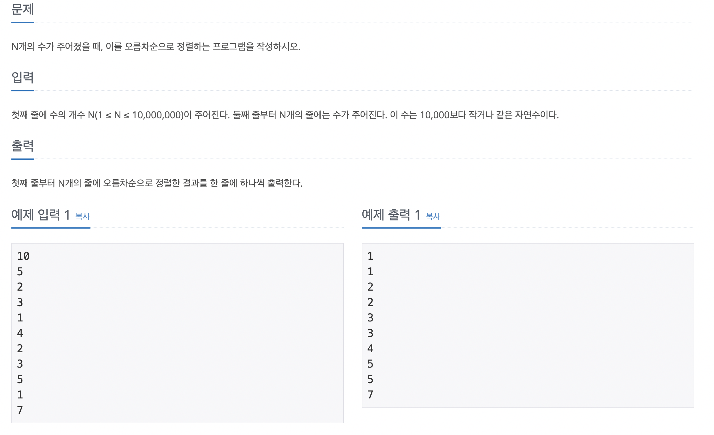 www.acmicpc.net/problem/10989 10989번: 수 정렬하기 3 첫째 줄에 수의 개수 N(1 ≤ N ≤ 10,000,000)이 주어진다. 둘째 줄부터 N개의 줄에는 숫자가 주어진다. 이 수는 10,000보다 작거나 같은 자연수이다. ww..