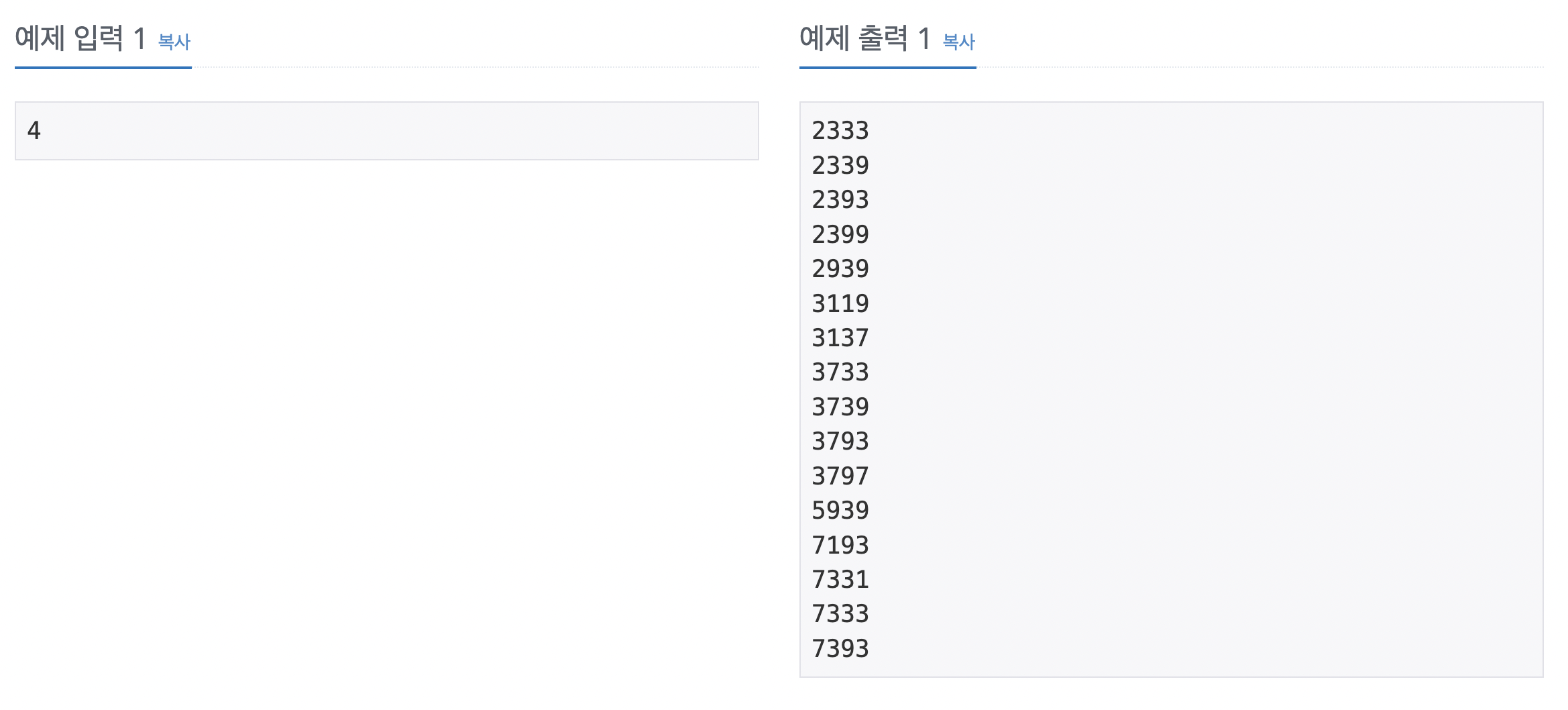 DFS는 재귀 함수의 형태를 띠고 있다. 자릿수가 두 개인 현재 수 * 10 + a를 계산해 이 수가 소수인지 판단하여 이 수가 소수인지 판단하고 소수라면 재귀 함수로 함수 자릿수를 하나 늘린다. a가 짝수인 경우는 항상 2를 약수로 가지므로 a가 짝수인 경우를 제외한다.