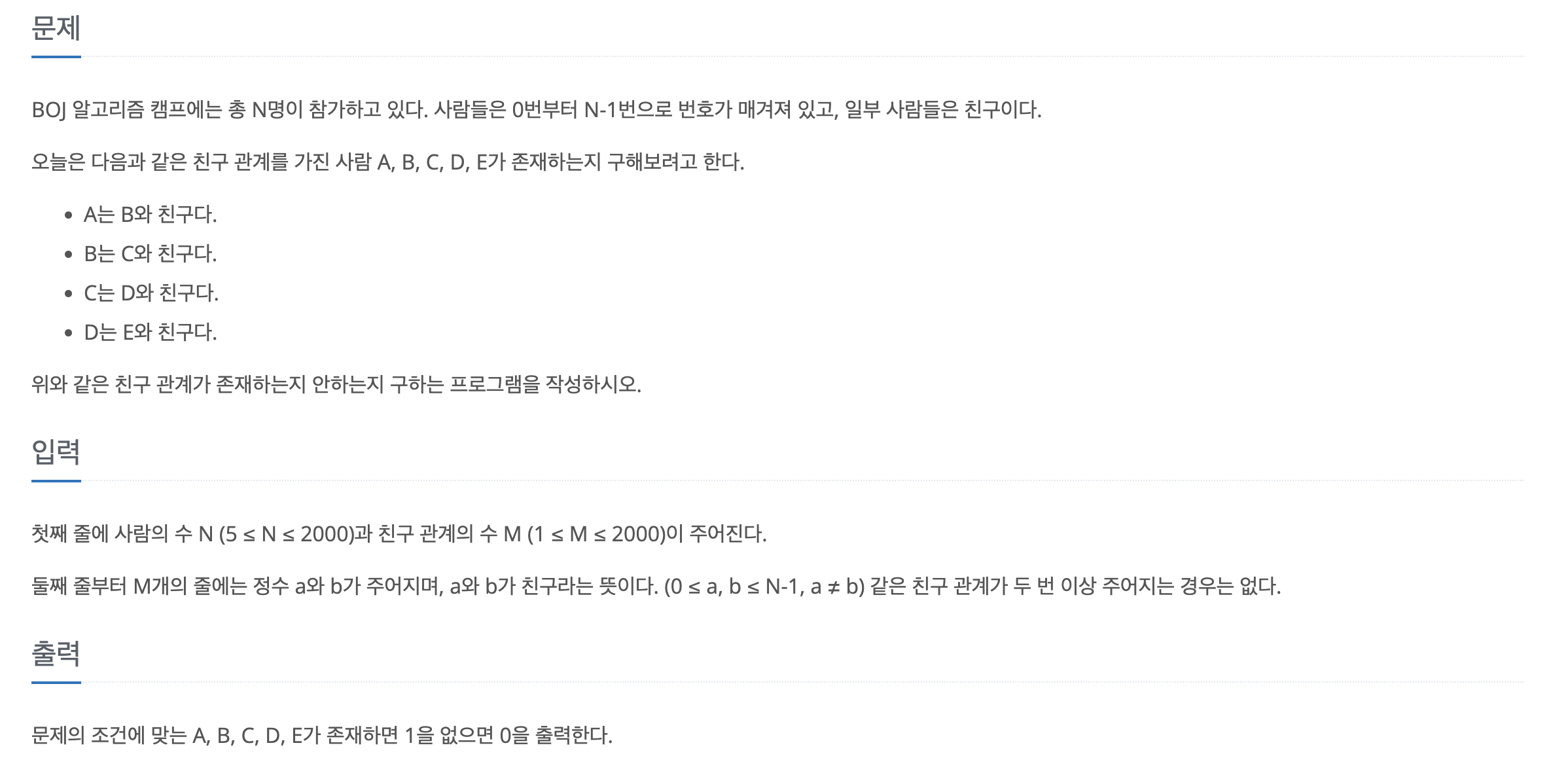 N의 최대 범위가 2,000이므로 알고리즘의 시간 복잡도를 고려할 때 자유롭다. 주어진 모든 노드에 DFS를 수행하고 재귀의 깊이가 5 이상이면 1 아니라면 0을 출력한다. DFS의 시간 복잡도는 O(V+E)이므로 최대 4,000 모든 노드를 진행했을 때 4000 * 2000이다.