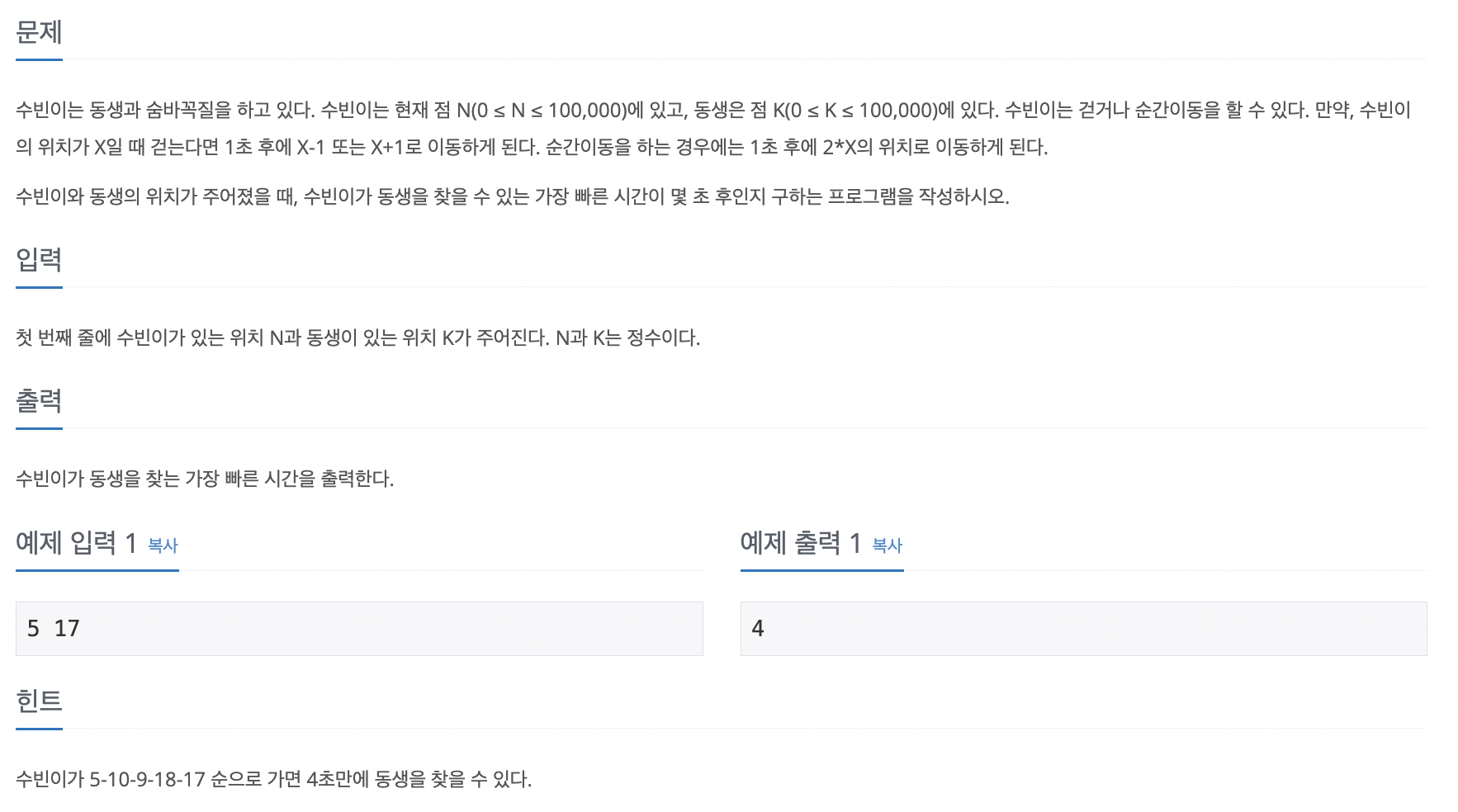 BFS를 응용해서 푸는 문제였다. BFS()를 호출한 후 BFS에서 arr 배열을 최대 크기 배열로 생성한 후 Queue에 n을 add한다. Queue가 비어있을 때까지 반복한다. now 값에 Queue에서 poll 한 값을 대입하고 for문을 i가 3보다 작을 때까지 반복한다. 1초 후에 now - 1, now + 1, now * 2로 움직여야한다. 만약 next가 k와 같다면 arr[now]를 리턴해준다. 또한 만약 next가 0보다 크거나 같고 next가 100001보다 작아야하고 arr[next]가 0일 때 arr[next]에 arr[now] + 1을 대입한다. 그리고 Queue에 next를 add한다.