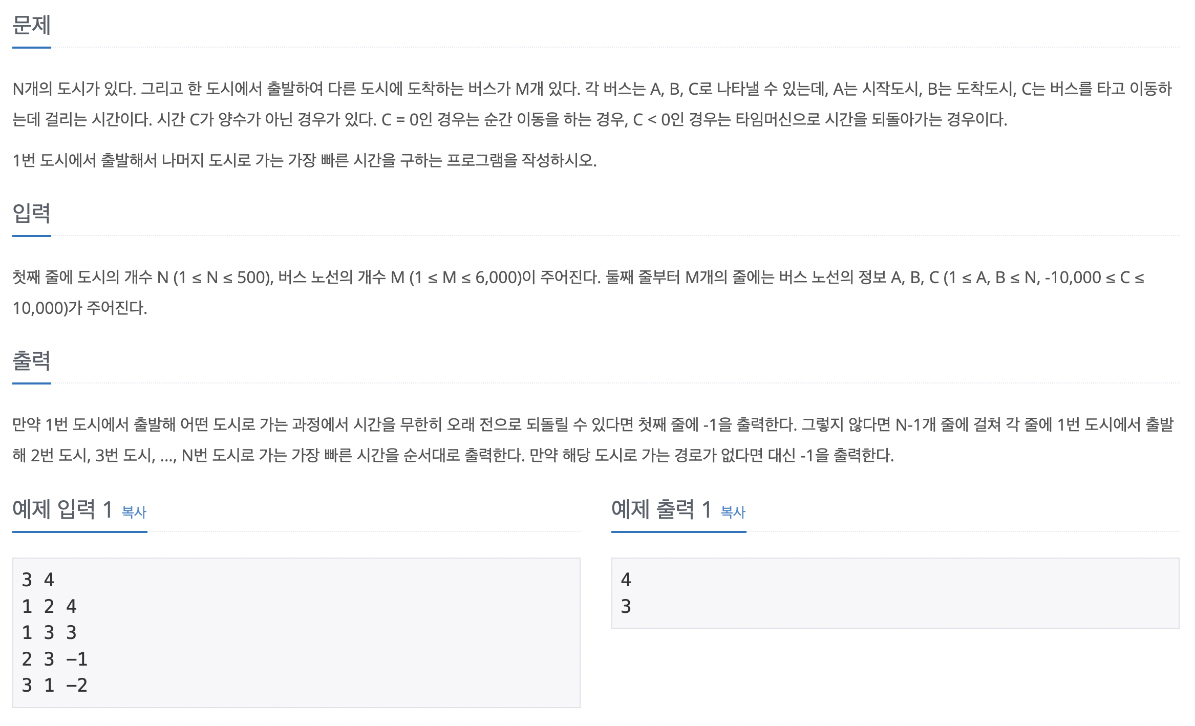 에지 리스트에 에지 데이터를 저장한 후 거리 배열을 초기화한다. 최초 시작점에 해당하는 거리 배열값은 0으로 초기화한다. 벨만-포드 알고리즘을 수행한다. 음수 사이클이 존재하면 -1, 존재하지 않으면 거리 배열의 값을 출력한다. 단, 거리 배열의 값이 INF일 경우에는 -1을 출력한다.
