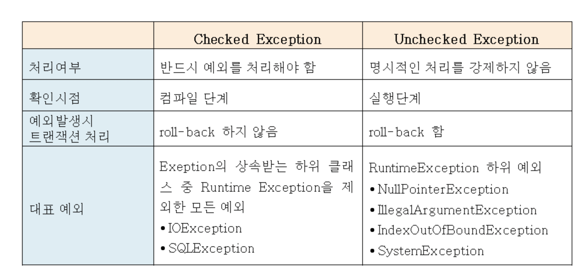 | Error | 의도하지 않은 에러가 발생한 경우프로그램이 종료되지 않음프로그램 내에서 개발자가 의도하지 않은 예외를 나타날 때 사용 |