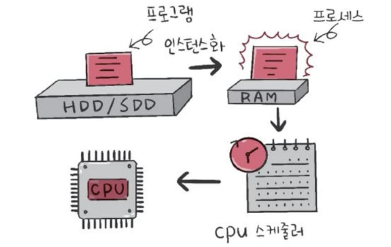 프로그램이 메모리에 올라가면 프로세스가 인스턴스화가 일어나고 이후 운영체제의 CPU 스케줄러에 따라 CPU프로세스를 실행한다.