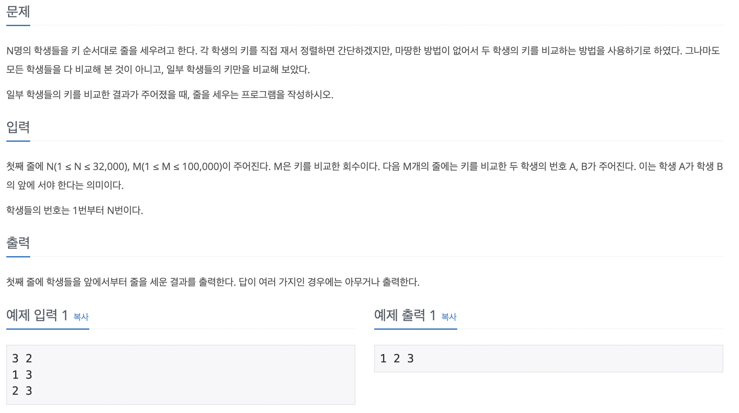 학생들을 노드로 생각하고, 키 순서 비교 데이터로 에지를 만든다고 생각했을 때 노드의 순서를 도출하는 가장 기본적인 문제이다. 특히 답이 여러 개일 때 아무것이나 출력해도 된다는 전제는 위상 정렬의 결괏값이 항상 유일하지 않다는 알고리즘의 전제와 동일하다는 것을 알 수 있다. 인접 리스트에 노드 데이터를 저장하고, 진입 차수 배열값을 업데이트한다. 위상 정렬 수행 과정은 진입 차수가 0인 노드를 큐에 저장한다 큐에서 데이터를 poll 해 해당 노드를 탐색 결과에 추가하고, 해당 노드가 가리키는 노드의 진입 차수를 1씩 감소한다. 감소했을 때 진입 차수가 0이 되는 노드를 큐에 offer 한다. 큐가 빌 때까지 반복한다.