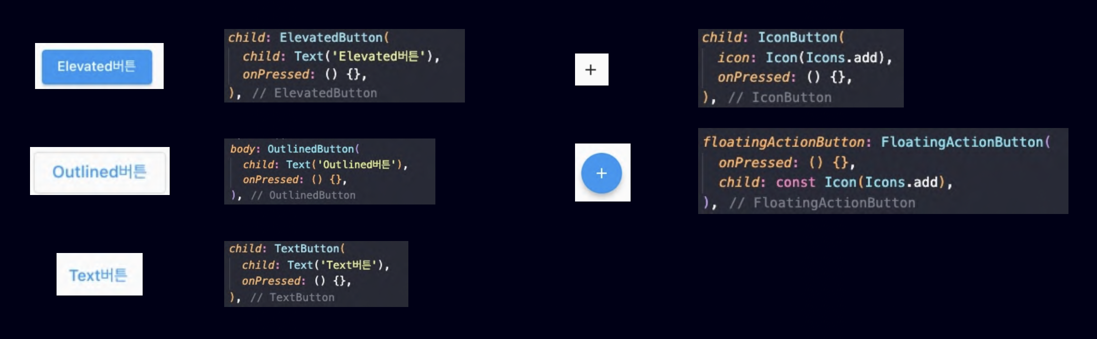 플러터에서 제공하는 공식 버튼은 크게 5가지인데, 그 버튼들은 다음과 같다. 상황에 맞게 바꾸어 사용하면 된다.