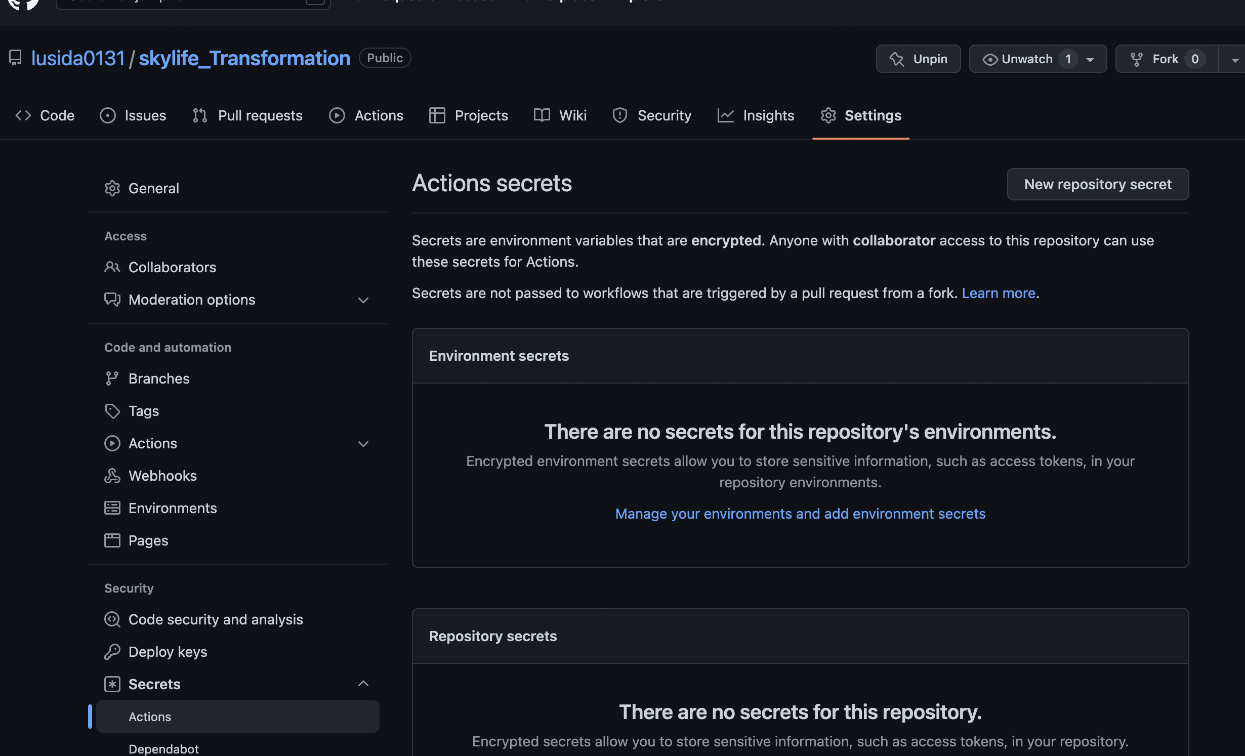 상위 메뉴의 Settings에 들어가 왼쪽 하단 메뉴의 Secrets의 Actions에 들어간다.