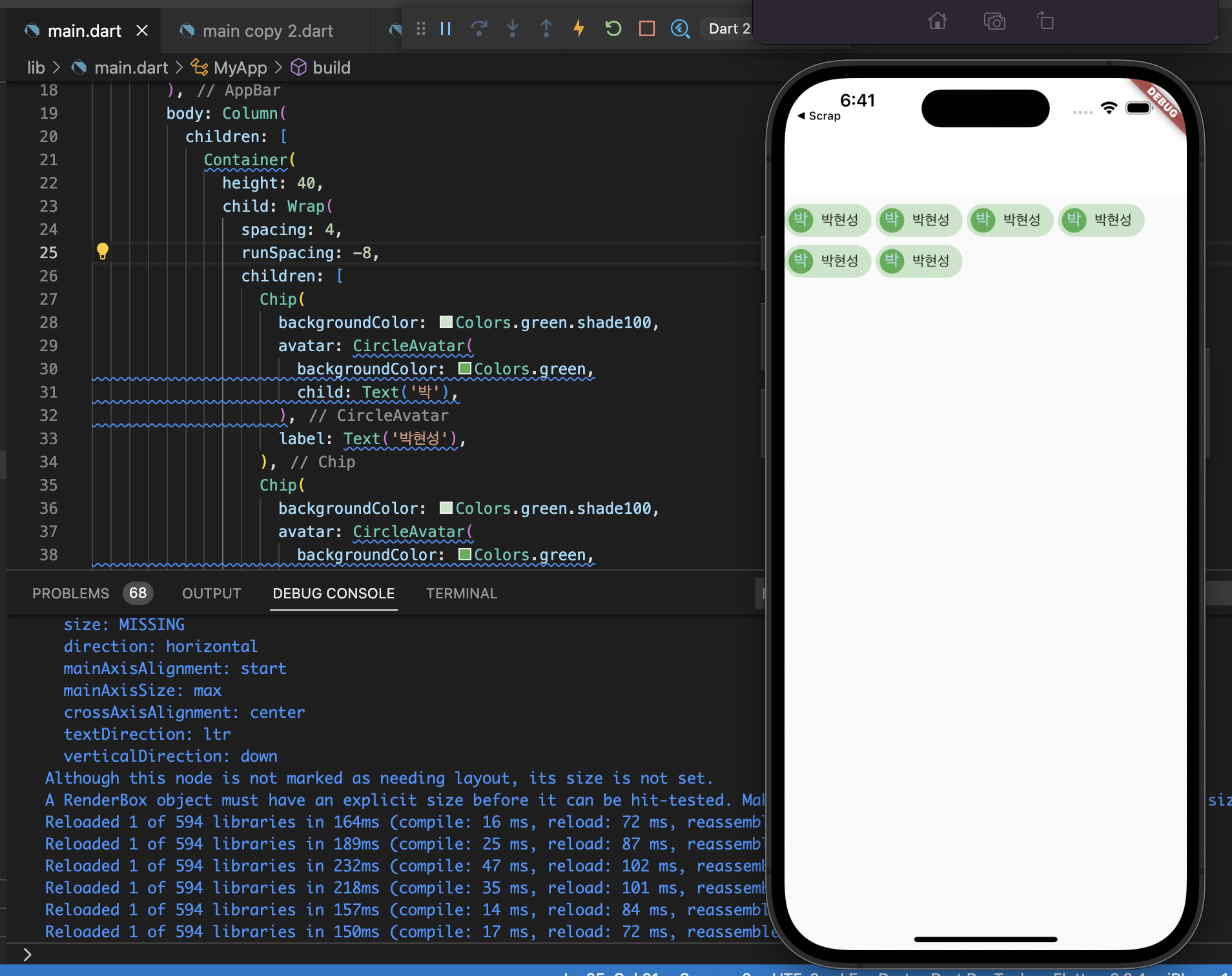 Wrap위젯은 children 안에 자식들을 넣어주면 된다. spacing 속성값을 통해 자식들 사이 간격을 정한다. runSpacing 속성 값을 통해 줄단위 사이 간격을 정한다.