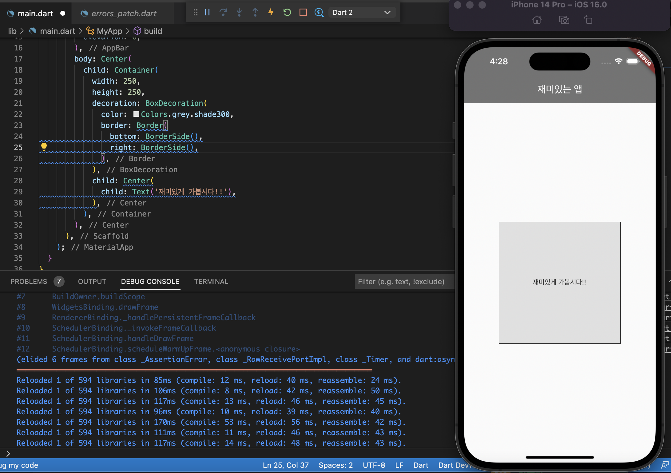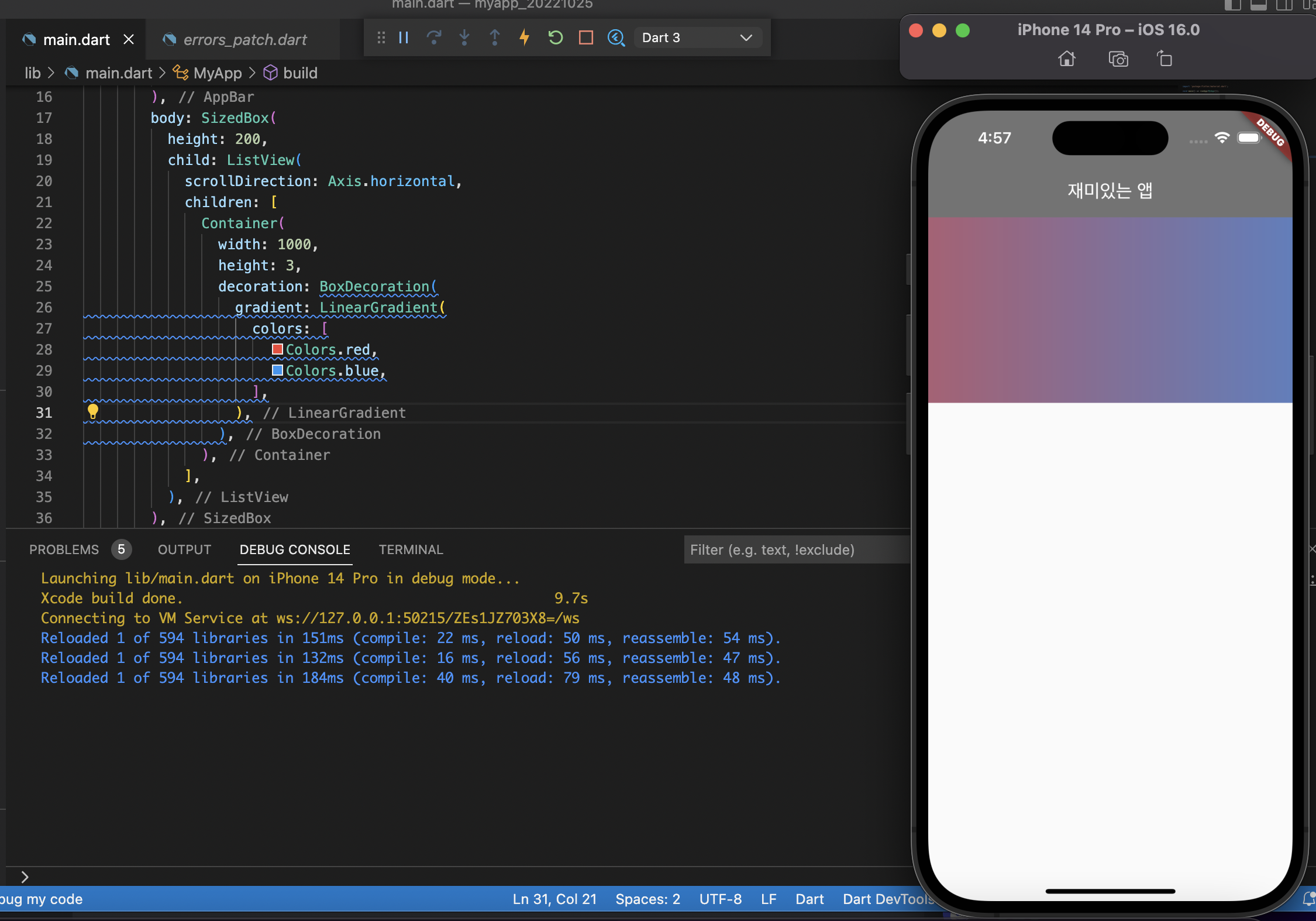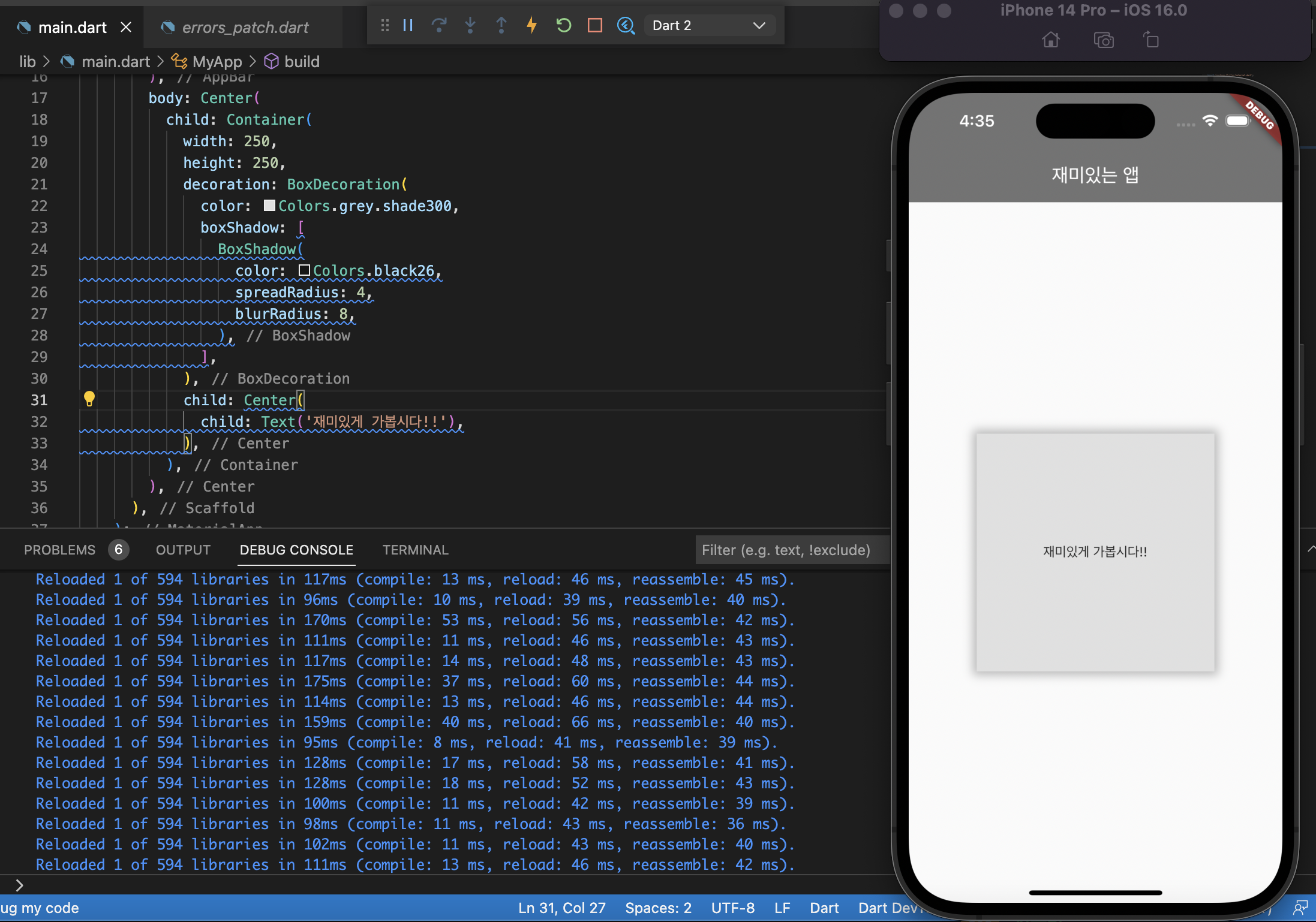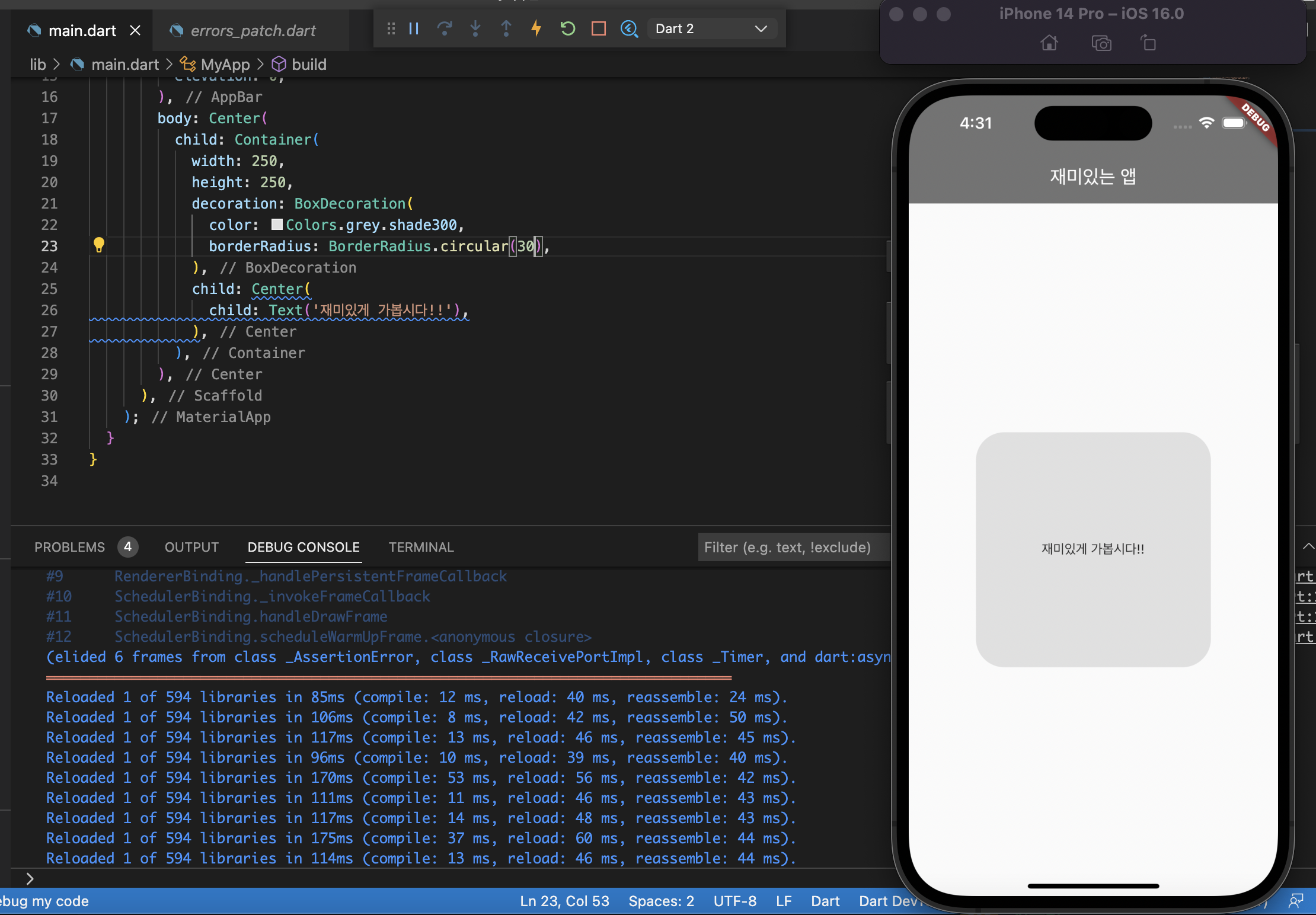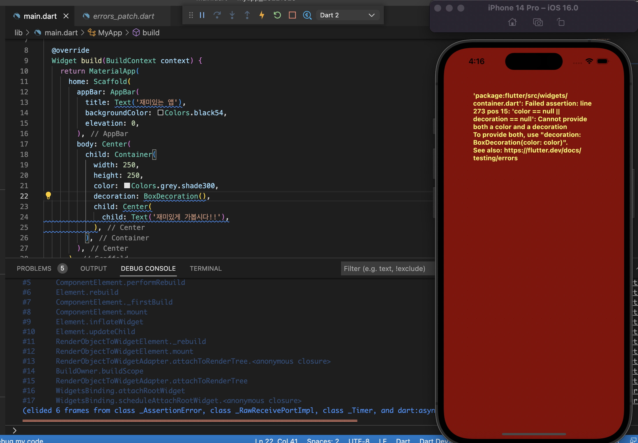 decoration을 사용한 이후부터는, color를 반드시 BoxDecoration 안에 넣어야 한다. color 속성을 옮기어 decoration 값 안에 넣는다.