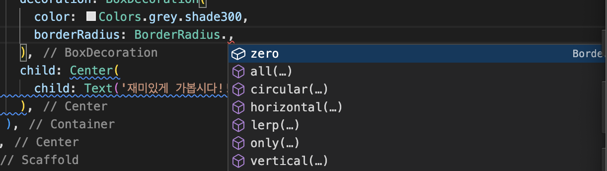 그리고, BoxDecoration 안에 디자인 속성을 하나하나씩 넣어주면 된다.