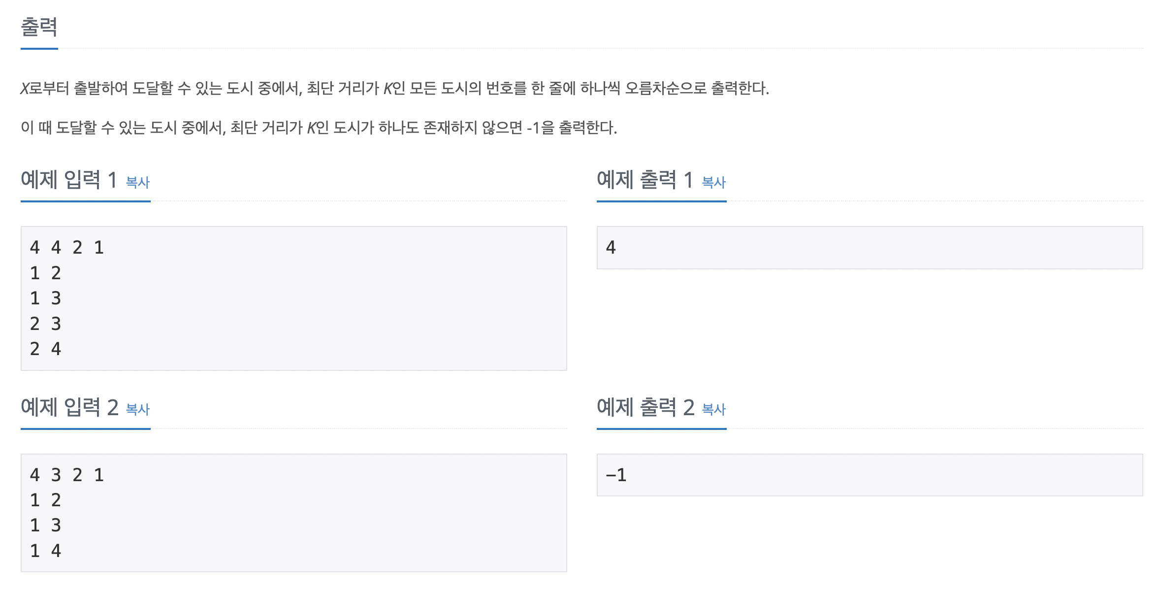 모든 도로 거리가 1이므로 가중치 없는 인접리스트로 표현할 수 있다. 도시의 개수가 300,000, 도로의 최대 크기가 1,000,000이므로 BFS 탐색으로 해결할 수 있다. 최초에는 방문 도시가 1이고, 이동하지 않았으므로 방문 배열에 0을 저장한다. 이후 방문하는 도시는 이전 도시의 방문 배열 값 +1을 방문 배열에 저장한다. 탐색 종료 후 방문 배열에 값이 k와 같은 도시의 번호를 출력한다.