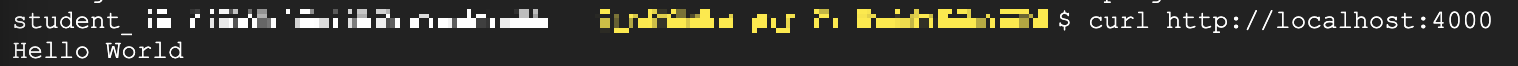 --name은 원하는 경우 컨테이너의 이름을 지정할 수 있습니다.호스트 의 -p포트 4000을 컨테이너의 포트 80에 매핑하도록 명령어를 작성했다. 이제 http://localhost:4000. 포트 매핑이 없으면 localhost의 컨테이너에 연결할 수 없습니다. 다른 터미널을 열고 서버를 테스트합니다. Hello World가 정상적으로 출력되는 것을 확인하실 수 있습니다.