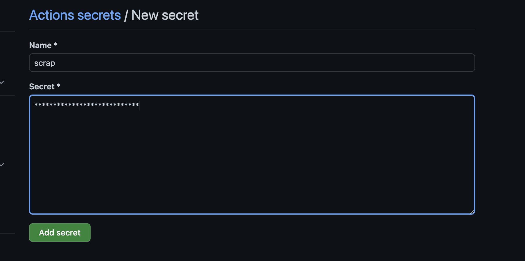 왼쪽 상단에 있는 New repository secret을 누른다.