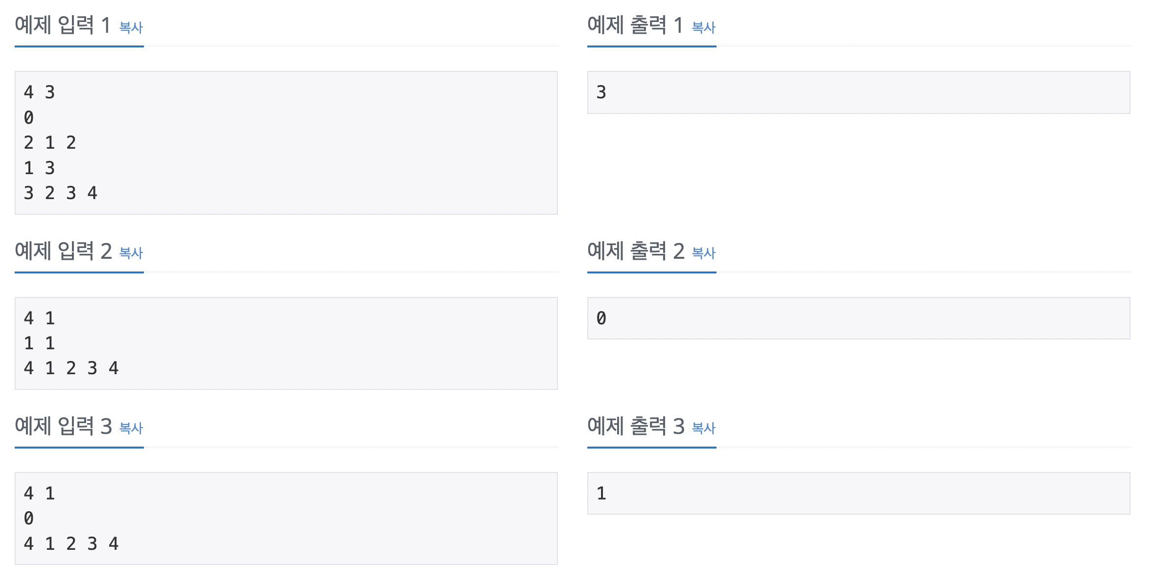 파티에 참석한 사람들을 1개의 집합으로 생각하고, 각각의 파티마다 union연산을 이용해 사람들을 연결하는 것이 중요하다. 이 작업을 하면 1개의 파티에 있는 모든 사람들은 같은 대표 노드를 바라보게 된다. 이후 각 파티의 대표 노드와 진실을 알고 있는 사람들의 각 대표 노드가 동일한지 find연산을 이용해 확인함으로써 과장된 이야기를 할 수 있는지 판단할 수 있다. 진실을 아는 사람 데이터, 파티 데이터, 유니온 파인드를 위한 대표 노드 자료구조를 초기화한다. union연산을 수행해 각 파티에 참여한 사람들을 1개의 그룹으로 만든다. find 연산을 수행해 각 파티의 대표 노드와 진실을 아는 사람들이 같은 그룹에 있는지 확인한다. 파티 사람 노드는 모두 연결돼 있으므로 아무 사람이나 지정해 find 연산을 수행하면 된다. 모든 파티에 관해 과정을 반복해 수행하고, 모든 파티의 대표 노드가 진실을 아는 사람들과 다른 그룹에 있다면 결괏값을 증가시킨다. 과장할 수 있는 파티의 개수를 결괏값으로 출력한다.